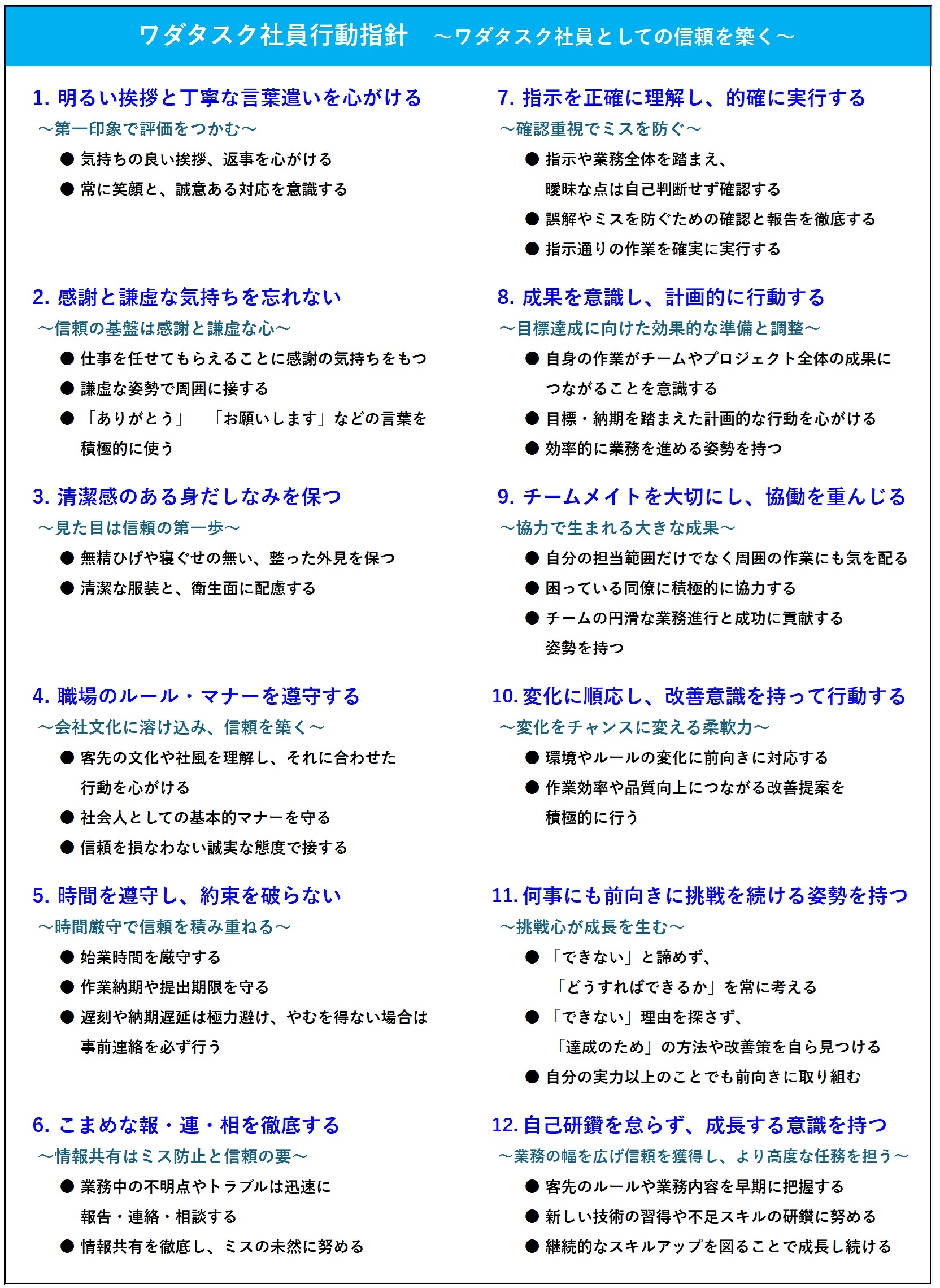 当社で働きたいと思って頂いている方は、『無期雇用の正社員』としてお迎えしたいと考えています。もちろんニーズは様々ですから、登録型派遣も準備を進めています。社員一人一人を大切な仲間だと思っているからこそ、じっくりと経験を積み、10年、20年と長いスパンでお客様と共に歩んで行って欲しいのです。そこには楽しい事も苦しい事もあると思いますが、どこよりもサポートが厚い当社なら、安心してその歩みを進められると思っています。未経験でも大丈夫。経験が浅い方も、ベテランの方も、次世代の産業の発展に携わりたいという方は大歓迎です。当社で長く活躍する人材のほとんどが異業種出身者ですし、人材育成には自信があります。興味を持たれた方は思い切ってワダタスクの門を叩いてみてください。あなたの未来はきっと明るいものになるはずです。